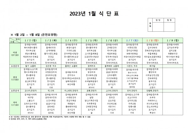 23년 1월 첫째주 식단표 페이지 정보 작성자 은천노인복지회 작성일22-12-30 15:21 조회83,362회 댓글0건 관련링크 이전글 다음글 목록 답변 본문 . 이전글 다음글 목록 답변