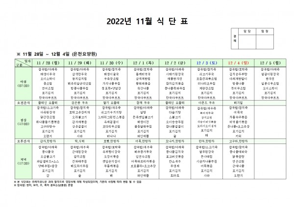 11월 넷째주 식단표 페이지 정보 작성자 은천노인복지회 작성일22-11-24 16:56 조회88,641회 댓글0건 관련링크 이전글 다음글 목록 답변 본문 . 이전글 다음글 목록 답변