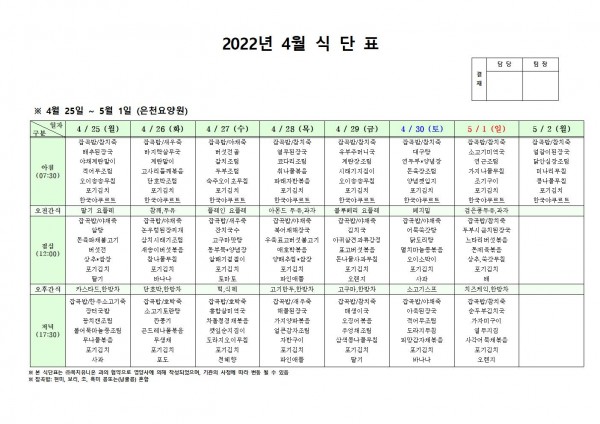 4월 넷째주 식단표 페이지 정보 작성자 은천노인복지회 작성일22-04-22 15:56 조회107,305회 댓글0건 관련링크 이전글 다음글 목록 답변 본문 . 이전글 다음글 목록 답변