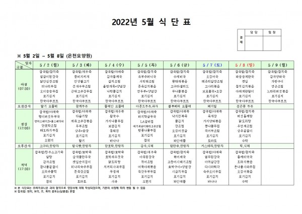 5월 첫째주 식단표 페이지 정보 작성자 은천노인복지회 작성일22-04-29 10:35 조회105,676회 댓글0건 관련링크 이전글 다음글 목록 답변 본문 . 이전글 다음글 목록 답변