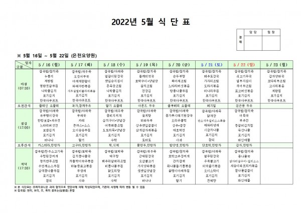 5월 셋째주 식단표 페이지 정보 작성자 은천노인복지회 작성일22-05-12 10:54 조회103,422회 댓글0건 관련링크 이전글 다음글 목록 답변 본문 . 이전글 다음글 목록 답변