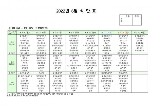 6월 둘째주 식단표 페이지 정보 작성자 은천노인복지회 작성일22-06-03 09:34 조회101,792회 댓글0건 관련링크 이전글 다음글 목록 답변 본문 . 이전글 다음글 목록 답변