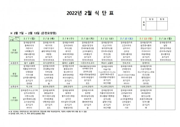 2월 둘째주 식단표 페이지 정보 작성자 은천노인복지회 작성일22-02-04 18:58 조회116,906회 댓글0건 관련링크 이전글 다음글 목록 답변 본문 . 이전글 다음글 목록 답변