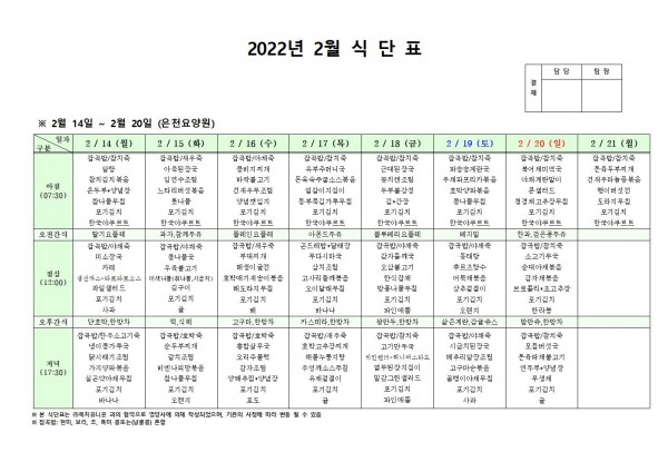 2월 셋째주 식단표 페이지 정보 작성자 은천노인복지회 작성일22-02-10 16:28 조회116,796회 댓글0건 관련링크 이전글 다음글 목록 답변 본문 . 이전글 다음글 목록 답변