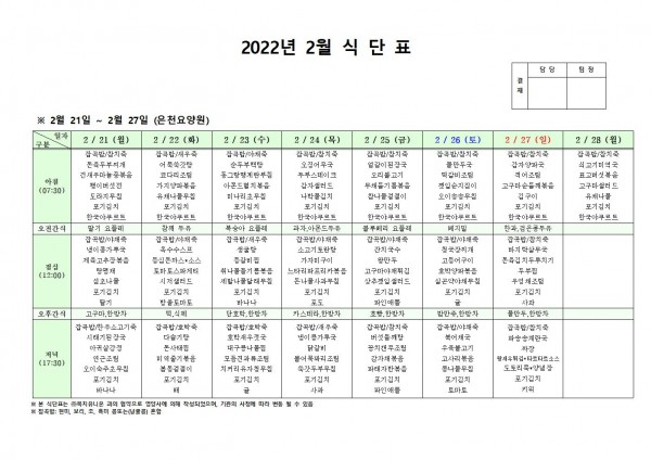 2월 넷째주 식단표 페이지 정보 작성자 은천노인복지회 작성일22-02-25 09:21 조회115,217회 댓글0건 관련링크 이전글 다음글 목록 답변 본문 . 이전글 다음글 목록 답변
