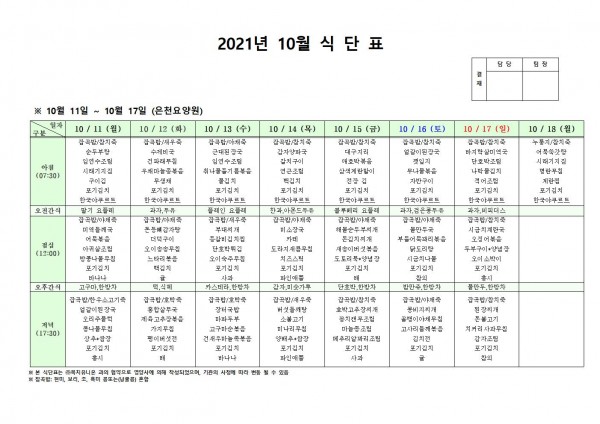 10월 둘째주 식단표 페이지 정보 작성자 은천노인복지회 작성일21-10-12 10:03 조회124,250회 댓글0건 관련링크 이전글 다음글 목록 답변 본문 . 이전글 다음글 목록 답변