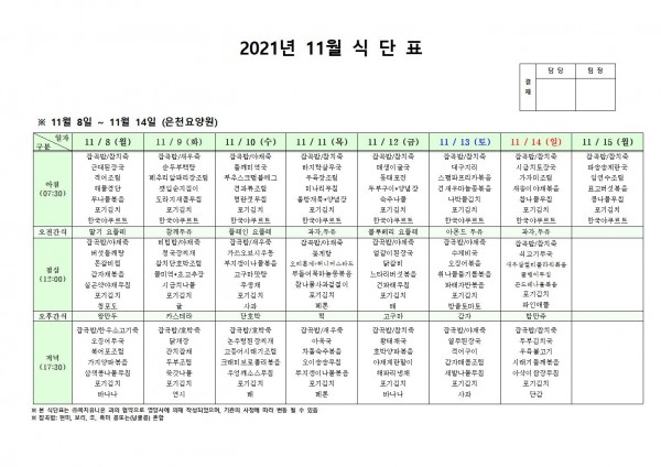11월 둘째주 식단표 페이지 정보 작성자 은천노인복지회 작성일21-11-04 16:57 조회123,710회 댓글0건 관련링크 이전글 다음글 목록 답변 본문 . 이전글 다음글 목록 답변