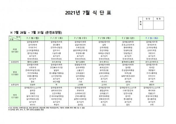 7월 넷째주 식단표 페이지 정보 작성자 은천노인복지회 작성일21-08-05 10:26 조회129,176회 댓글0건 관련링크 이전글 다음글 목록 답변 본문 . 이전글 다음글 목록 답변
