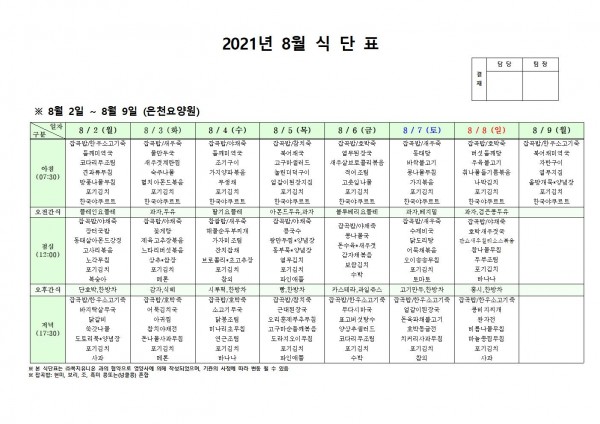 8월 첫째주 식단표 페이지 정보 작성자 은천노인복지회 작성일21-08-05 10:26 조회129,154회 댓글0건 관련링크 이전글 다음글 목록 답변 본문 . 이전글 다음글 목록 답변
