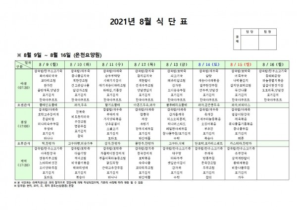 8월 둘째주 식단표 페이지 정보 작성자 은천노인복지회 작성일21-08-12 15:05 조회129,263회 댓글0건 관련링크 이전글 다음글 목록 답변 본문 . 이전글 다음글 목록 답변