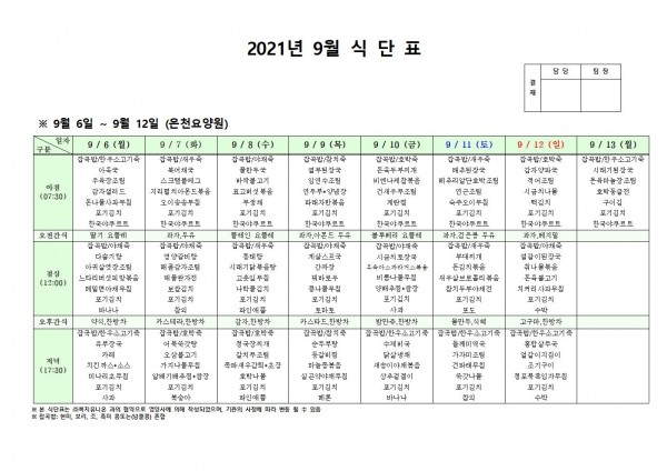 9월 둘째주 식단표 페이지 정보 작성자 은천노인복지회 작성일21-09-02 16:30 조회126,266회 댓글0건 관련링크 이전글 다음글 목록 답변 본문 . 이전글 다음글 목록 답변
