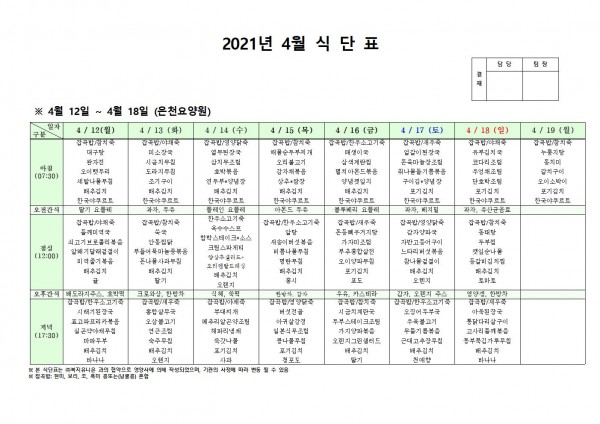4월 둘째주 식단표 페이지 정보 작성자 은천노인복지회 작성일21-04-08 19:12 조회137,308회 댓글0건 관련링크 이전글 다음글 목록 답변 본문 4월 둘째주 식단표 이전글 다음글 목록 답변