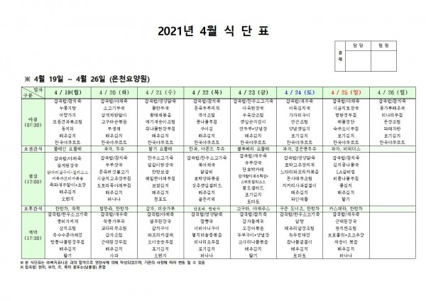 4월 셋째주 식단표 페이지 정보 작성자 은천노인복지회 작성일21-04-15 19:35 조회137,736회 댓글0건 관련링크 이전글 다음글 목록 답변 본문 4월 셋째주 식단표 이전글 다음글 목록 답변