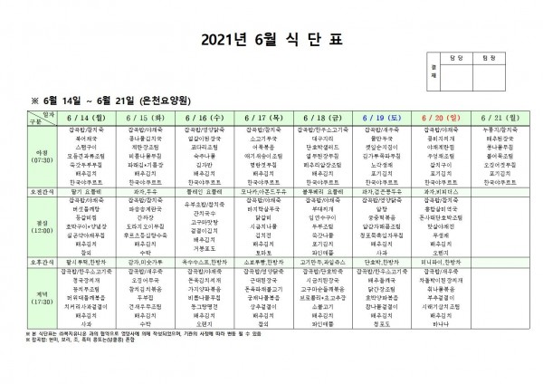 6월 셋째주 식단표 페이지 정보 작성자 은천노인복지회 작성일21-06-11 10:28 조회131,586회 댓글0건 관련링크 이전글 다음글 목록 답변 본문 . 이전글 다음글 목록 답변