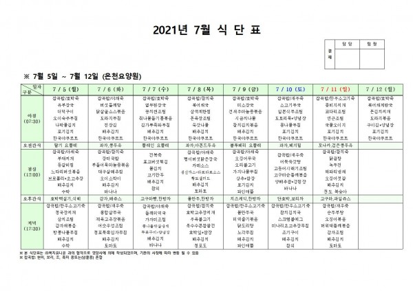 7월 첫째주 식단표 페이지 정보 작성자 은천노인복지회 작성일21-07-02 16:57 조회131,481회 댓글0건 관련링크 이전글 다음글 목록 답변 본문 . 이전글 다음글 목록 답변