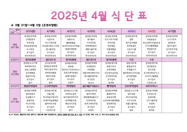 2025년 4월 첫주 식단표 페이지 정보 작성자 은천노인복지회 작성일25-03-28 10:25 조회11,147회 댓글0건 관련링크 이전글 다음글 목록 답변 본문 . 이전글 다음글 목록 답변
