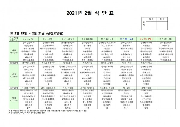 2월 셋째주 식단표 페이지 정보 작성자 은천노인복지회 작성일21-02-15 14:12 조회144,306회 댓글0건 관련링크 이전글 다음글 목록 답변 본문 2월 식단표 [이 게시물은 은천노인복지회님에 의해 2021-03-12 17:18:24 공지사항에서 이동 됨] 이전글 다음글 목록 답변