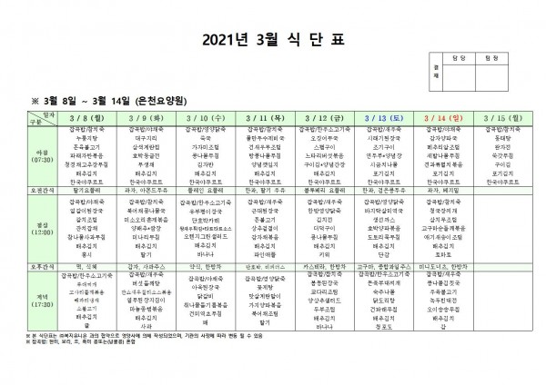 3월 둘째주 식단표 페이지 정보 작성자 은천노인복지회 작성일21-03-04 17:55 조회141,744회 댓글0건 관련링크 이전글 다음글 목록 답변 본문 3월 식단표 [이 게시물은 은천노인복지회님에 의해 2021-03-12 17:18:24 공지사항에서 이동 됨] 이전글 다음글 목록 답변