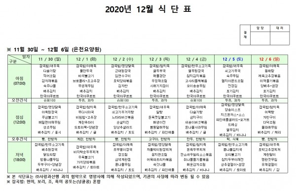 12월 첫째주 식단표 페이지 정보 작성자 은천노인복지회 작성일20-12-08 18:10 조회151,360회 댓글0건 관련링크 이전글 다음글 목록 답변 본문 . 이전글 다음글 목록 답변