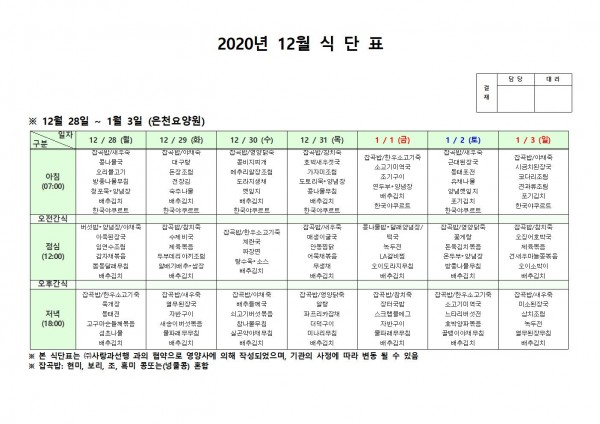 12월 다섯째주 식단표 페이지 정보 작성자 은천노인복지회 작성일20-12-24 18:17 조회147,224회 댓글0건 관련링크 이전글 다음글 목록 답변 본문 . 이전글 다음글 목록 답변