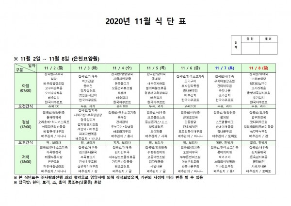 11월 첫째주 식단표 페이지 정보 작성자 은천노인복지회 작성일20-11-13 13:47 조회154,156회 댓글0건 관련링크 이전글 다음글 목록 답변 본문 . 이전글 다음글 목록 답변