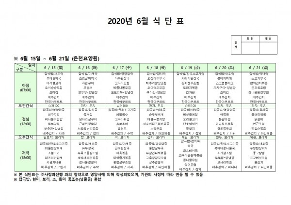 6월 셋째주 식단표 페이지 정보 작성자 은천노인복지회 작성일20-06-22 16:16 조회166,564회 댓글0건 관련링크 이전글 다음글 목록 답변 본문 . 이전글 다음글 목록 답변