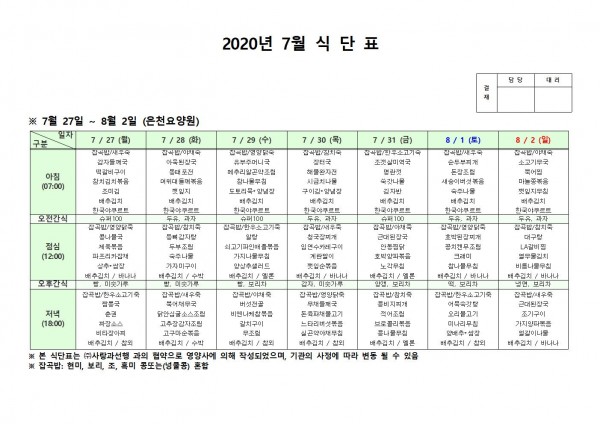 7월 다섯째주 식단표 페이지 정보 작성자 은천노인복지회 작성일20-08-10 11:32 조회162,721회 댓글0건 관련링크 이전글 다음글 목록 답변 본문 . 이전글 다음글 목록 답변