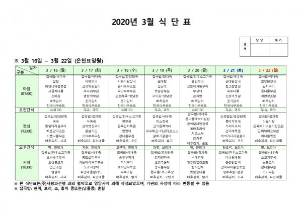 3월 셋째주 식단표 페이지 정보 작성자 은천노인복지회 작성일20-03-23 14:50 조회177,913회 댓글0건 관련링크 이전글 다음글 목록 답변 본문 . 이전글 다음글 목록 답변