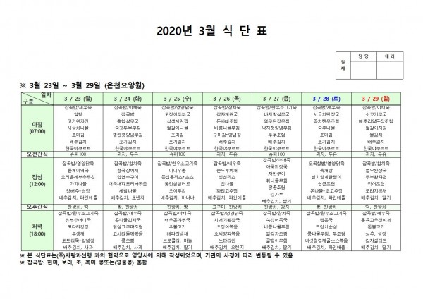 3월 넷째주 식단표 페이지 정보 작성자 은천노인복지회 작성일20-03-31 16:09 조회177,309회 댓글0건 관련링크 이전글 다음글 목록 답변 본문 . 이전글 다음글 목록 답변