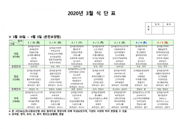 3월 다섯째주 식단표 페이지 정보 작성자 은천노인복지회 작성일20-04-06 14:47 조회176,283회 댓글0건 관련링크 이전글 다음글 목록 답변 본문 . 이전글 다음글 목록 답변