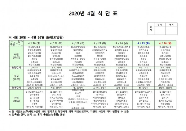 4월 셋째주 식단표 페이지 정보 작성자 은천노인복지회 작성일20-04-27 16:31 조회173,202회 댓글0건 관련링크 이전글 다음글 목록 답변 본문 . 이전글 다음글 목록 답변