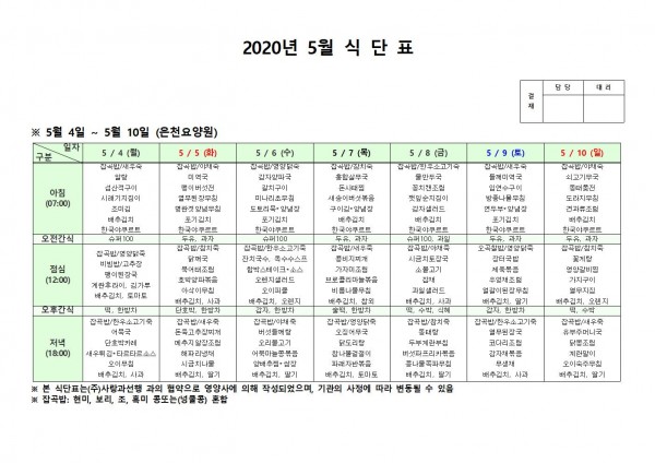 5월 첫째주 식단표 페이지 정보 작성자 은천노인복지회 작성일20-05-18 16:01 조회170,212회 댓글0건 관련링크 이전글 다음글 목록 답변 본문 . 이전글 다음글 목록 답변