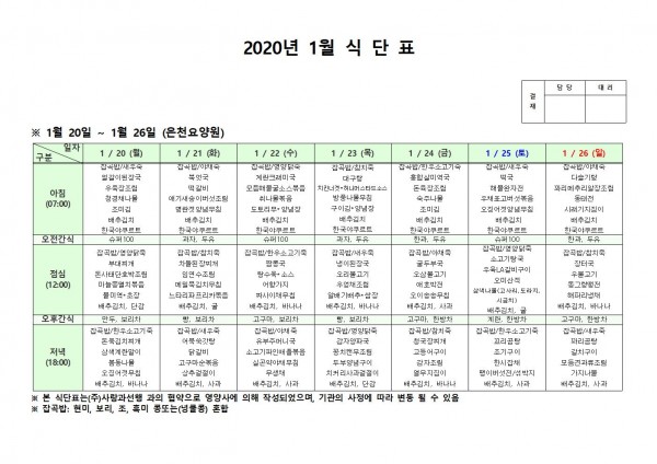1월 셋째주 식단표 페이지 정보 작성자 은천노인복지회 작성일20-01-28 14:25 조회182,777회 댓글0건 관련링크 이전글 다음글 목록 답변 본문 1월 셋째주 식단표입니다. 이전글 다음글 목록 답변