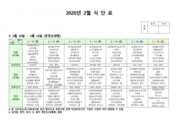 2월 둘째주 식단표 페이지 정보 작성자 은천노인복지회 작성일20-02-17 10:27 조회179,150회 댓글0건 관련링크 이전글 다음글 목록 답변 본문 ㅇㅅㅇ 이전글 다음글 목록 답변