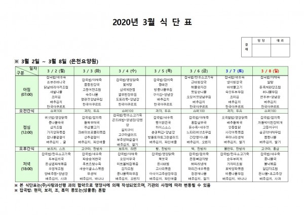 3월 첫째주 식단표 페이지 정보 작성자 은천노인복지회 작성일20-03-09 11:55 조회177,368회 댓글0건 관련링크 이전글 다음글 목록 답변 본문 . 이전글 다음글 목록 답변