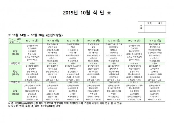 10월 셋째주 식단표 페이지 정보 작성자 은천노인복지회 작성일19-10-21 15:50 조회190,575회 댓글0건 관련링크 이전글 다음글 목록 답변 본문 10월 셋째주 식단표 이전글 다음글 목록 답변