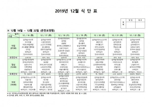 12월 셋째주 식단표 페이지 정보 작성자 은천노인복지회 작성일19-12-23 14:06 조회185,739회 댓글0건 관련링크 이전글 다음글 목록 답변 본문 12월 셋째주 식단표입니다. 이전글 다음글 목록 답변