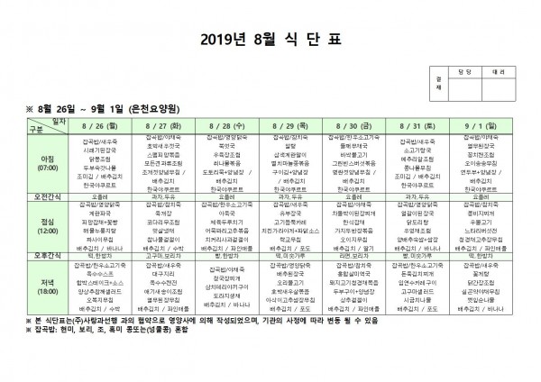 8월 다섯째주 식단표 페이지 정보 작성자 은천노인복지회 작성일19-09-04 17:29 조회194,504회 댓글0건 관련링크 이전글 다음글 목록 답변 본문 8월 다섯째주 식단표 이전글 다음글 목록 답변