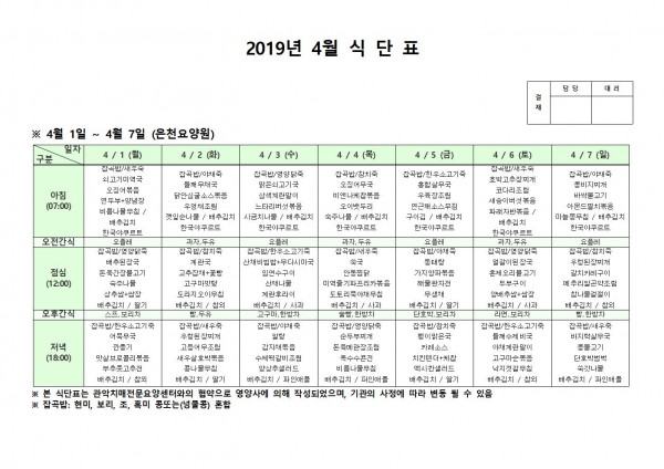 4월 첫째주 식단표 페이지 정보 작성자 은천노인복지회 작성일19-04-08 11:56 조회203,211회 댓글0건 관련링크 이전글 다음글 목록 답변 본문 4월 첫째주 식단표 이전글 다음글 목록 답변