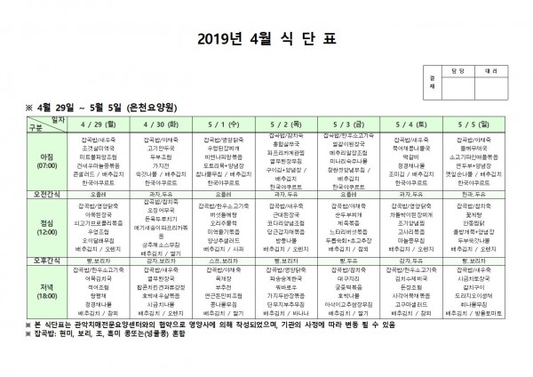 4월 다섯째주 식단표 페이지 정보 작성자 은천노인복지회 작성일19-05-07 14:13 조회202,521회 댓글0건 관련링크 이전글 다음글 목록 답변 본문 4월 다섯째주 식단표 이전글 다음글 목록 답변