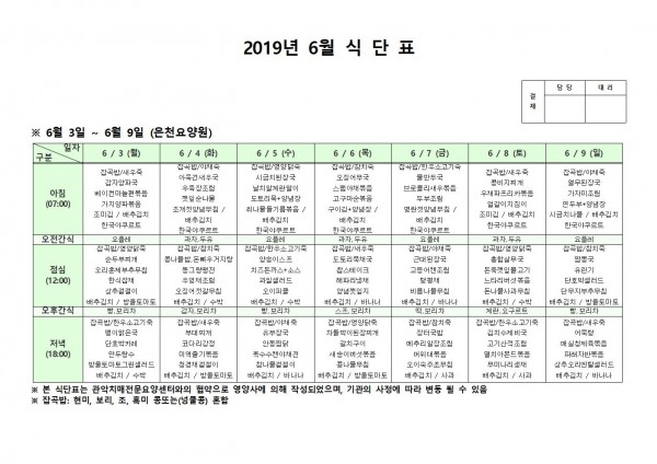 6월 첫째주 식단표 페이지 정보 작성자 은천노인복지회 작성일19-06-10 11:57 조회199,324회 댓글0건 관련링크 이전글 다음글 목록 답변 본문 6월 첫째주 식단표 이전글 다음글 목록 답변