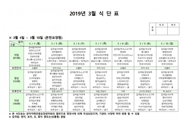 3월 첫째주 식단표 페이지 정보 작성자 은천노인복지회 작성일19-03-13 09:44 조회203,521회 댓글0건 관련링크 이전글 다음글 목록 답변 본문 3월 첫째주 식단표 이전글 다음글 목록 답변