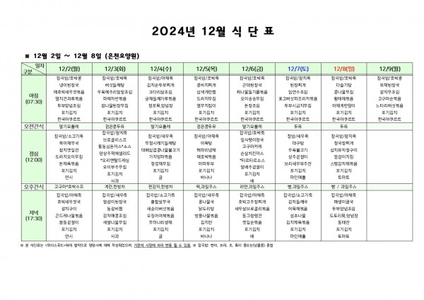 12월 첫째주 식단표 페이지 정보 작성자 은천노인복지회 작성일24-11-29 16:53 조회18,006회 댓글0건 관련링크 이전글 다음글 목록 답변 본문 . 이전글 다음글 목록 답변