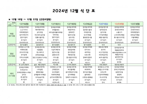 12월 셋째주 식단표 페이지 정보 작성자 은천노인복지회 작성일24-12-13 09:36 조회17,222회 댓글0건 관련링크 이전글 다음글 목록 답변 본문 . 이전글 다음글 목록 답변