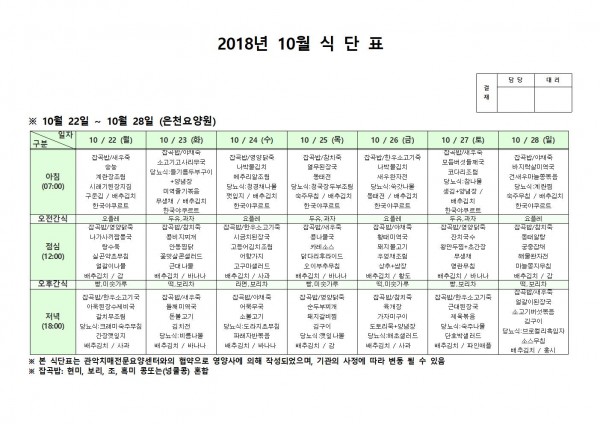 10월 넷째주 식단표 페이지 정보 작성자 은천노인복지회 작성일18-10-30 09:49 조회204,077회 댓글0건 관련링크 이전글 다음글 목록 답변 본문 10월 넷째주 식단표 이전글 다음글 목록 답변