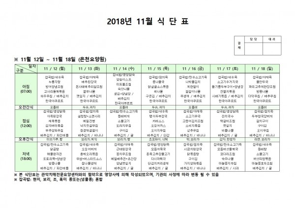 11월 2주째 식단표 페이지 정보 작성자 은천노인복지회 작성일18-12-07 09:37 조회205,198회 댓글0건 관련링크 이전글 다음글 목록 답변 본문 11월 2주째 식단표 이전글 다음글 목록 답변
