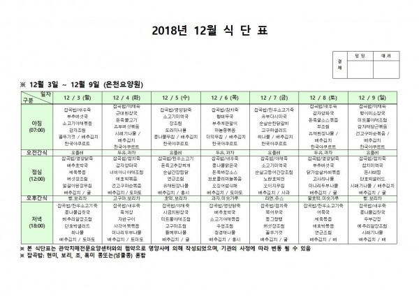 12월 첫째주 식단표 페이지 정보 작성자 은천노인복지회 작성일18-12-28 09:44 조회206,620회 댓글0건 관련링크 이전글 다음글 목록 답변 본문 12월 첫째주 식단표 이전글 다음글 목록 답변