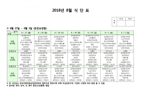 8월 다섯째주 식단표 페이지 정보 작성자 은천노인복지회 작성일18-09-11 09:27 조회204,930회 댓글0건 관련링크 이전글 다음글 목록 답변 본문 8월 다섯째주 기단표 이전글 다음글 목록 답변