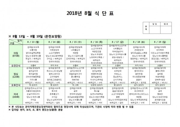 8월 셋째주 식단표 페이지 정보 작성자 은천노인복지회 작성일18-08-27 09:47 조회204,608회 댓글0건 관련링크 이전글 다음글 목록 답변 본문 8월 셋째주 식단표 이전글 다음글 목록 답변