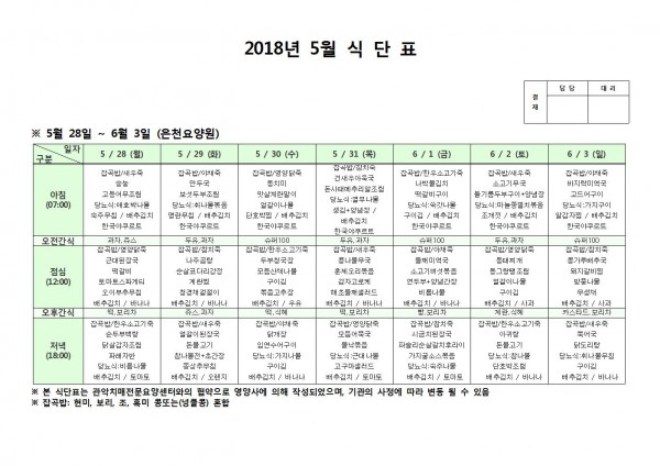 5월 다섯째주 식단표 페이지 정보 작성자 은천노인복지회 작성일18-06-07 10:39 조회204,704회 댓글0건 관련링크 이전글 다음글 목록 답변 본문 5월 다섯쨰주 식단표 이전글 다음글 목록 답변